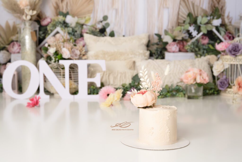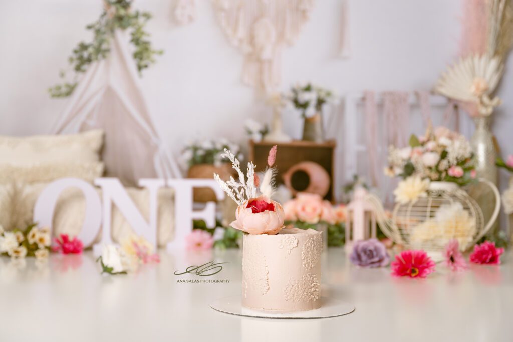 Step into a world of pure sweetness with this “pretty in pink” themed cake smash. Perfect for a little princess who adores all things pink. The setup is mostly pink and gold accents for an added feeling of elegance, complemented by a couple of flowers in light pastel shades. The cake comes in a neutral colour, allowing the backdrop and your baby girl to be the show’s star. Dressed in her finest attire, your little one will shine amidst this dreamy theme. It is a celebration of all things precious and beautiful, capturing the grace of your little darling in a setting as lovely as she is.