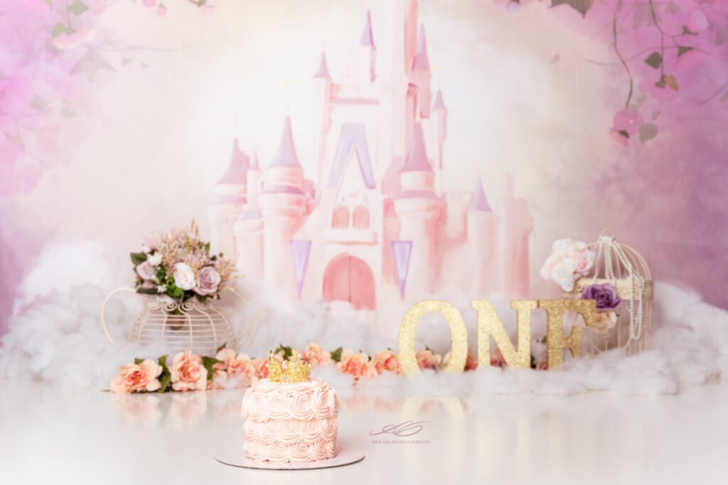 Step into a fairy-tale realm with this enchanting princess-themed cake smash. Designed for a celebration as special and regal as your baby princess. The cake is adorned with a golden tiara, and adding to the regal atmosphere is the pastel pink castle in the background. Your little princess, dressed in her finest attire, will be the star of the show.